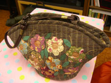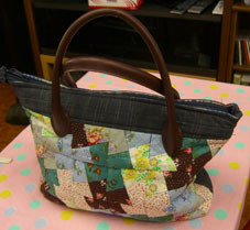 | しーちゃんバックの持ち手が難しかったのでは? ミシンでできないだろうし苦労なさったのでしょう配色もよく裏表にパッチワークが施されているのがいいです。内側にもポケットがあるのは便利 |