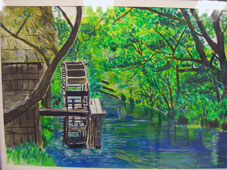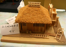 | サブちゃん細かい仕事ですね。からぶき屋根の中まで細工してあり器用な人しか出来ないみたい水車も大八車も きっと指が細くて器用なのね。 |