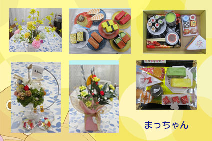 | まっちゃん 細かい動作はまっちゃんのお得意。器用だからできるのですね。お寿司はおいしそうにできているしお花はとてもきれい。端正込められて作る気持ちがお花に表れているようです。 |